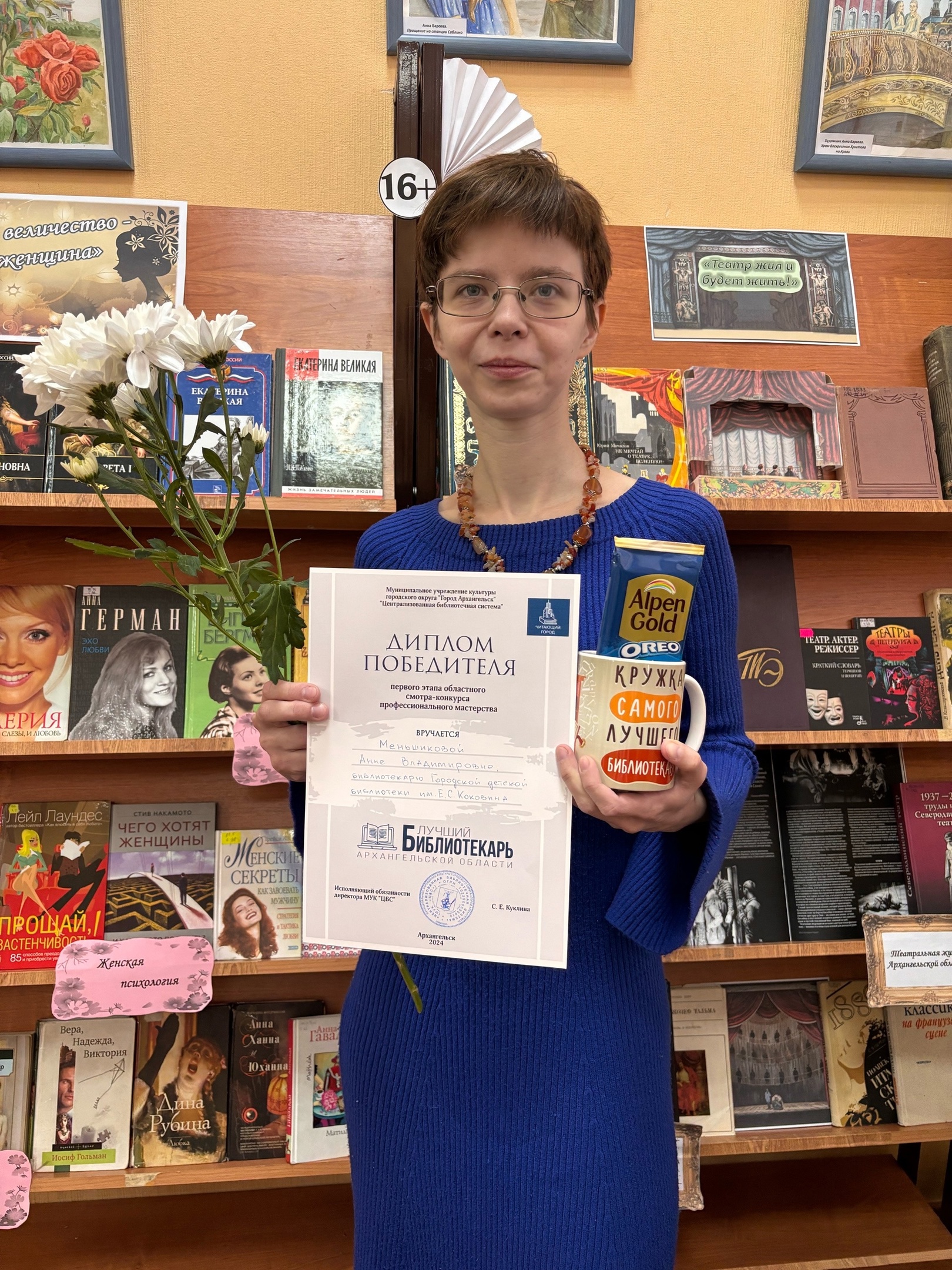 Наибольшее количество баллов набрала Меньшикова Анна Владимировна, библиотекарь первой модельной библиотеки Архангельска. Молодой специалист представит столицу Поморья во втором (заочном) этапе смотра-конкурса, будет бороться за звание лучшего библиотекаря региона.